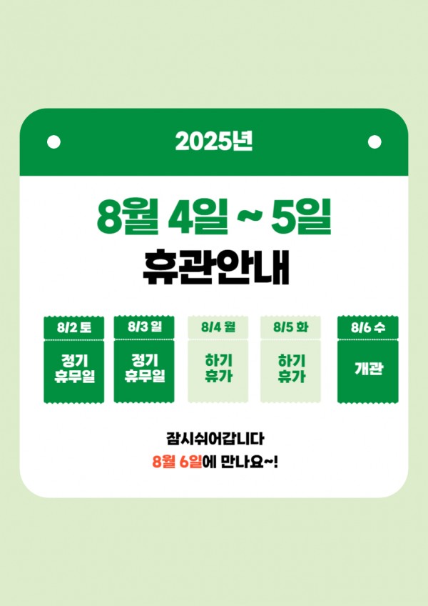 휴관일정: 2025년 8월 4일(월) ~ 8월 5일(화)