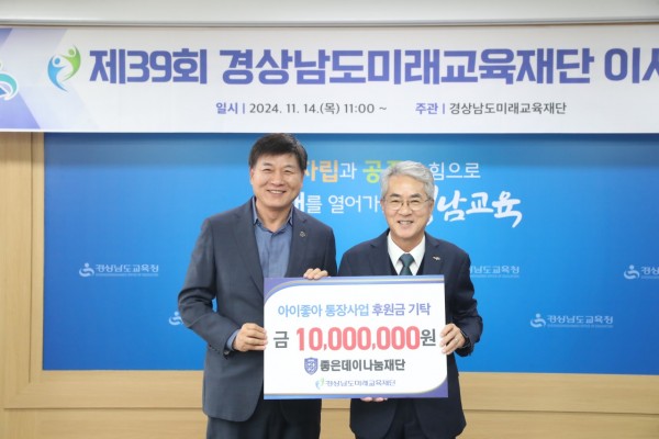 - 14일 경상남도교육청에서 열린 경상남도미래교육재단 이사회에서 '좋은데이나눔재단 아이좋아 통장사업 후원 기탁식'을 갖고 회장님께서 박종훈 경남도교육감에게 후원금 1천만 원을 기탁